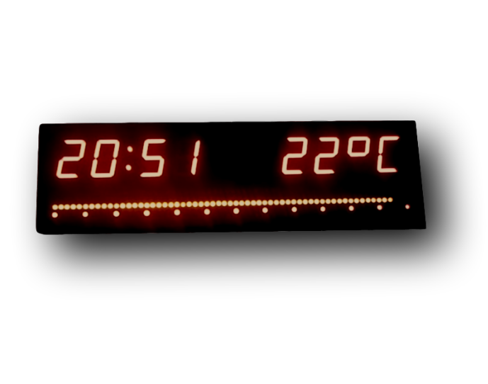 Mtg elektronik güvencesi altında 2 yıl garantilidir. Ürün saat- dakika bilgisini ve bağımsız termometre bilgisini displey ekranda, saniye bilgisini ise dairesel olarak analog saat görünümünde sunan bir yapıda tasarlanmıştır. Saniyeler sona geldiğinde yani dakika bittiğinde son saniyede bir animasyonla ledler tekrar ilk saniyeye kadar geri gelir. 220V besleme ile çalışır. Kasası pvc dir. Ayar butonları saatin alt kısmında bulunur.Bu butonlardan ilki saati diğeri ise dakikayı ayarlar.
